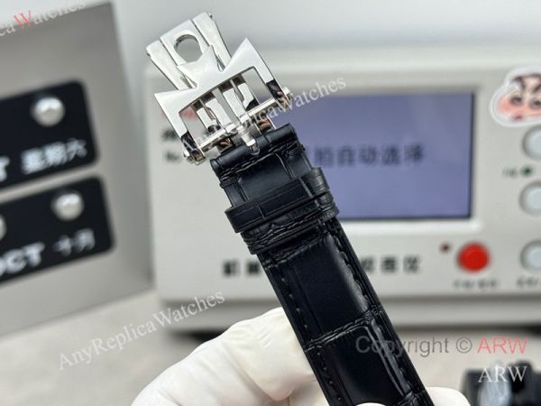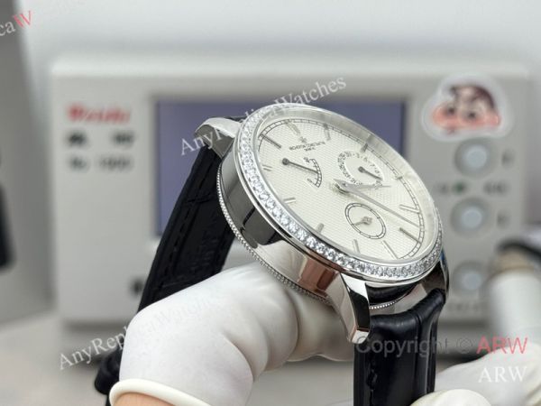 High Quality Replica VACHERON CONSTANTIN Traditionnelle Black Leather Strap White Face Dial White Diamonds Stainless Steel Case Watch 40×12mm