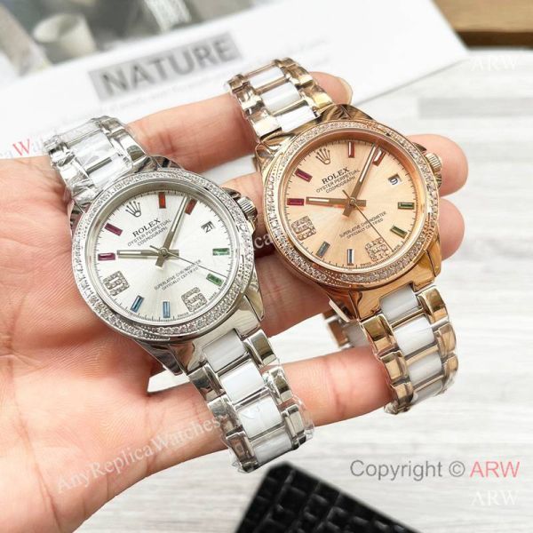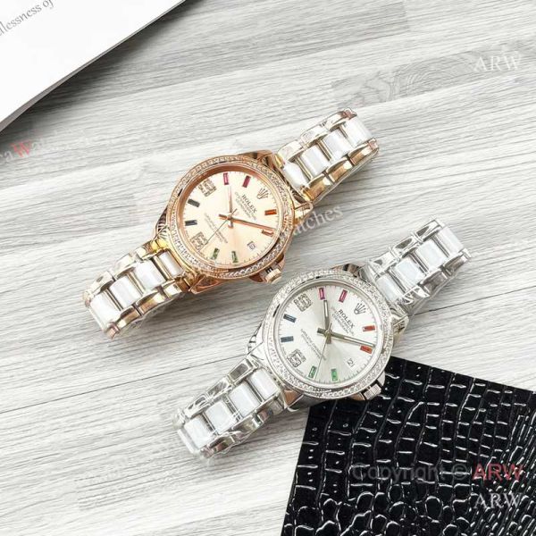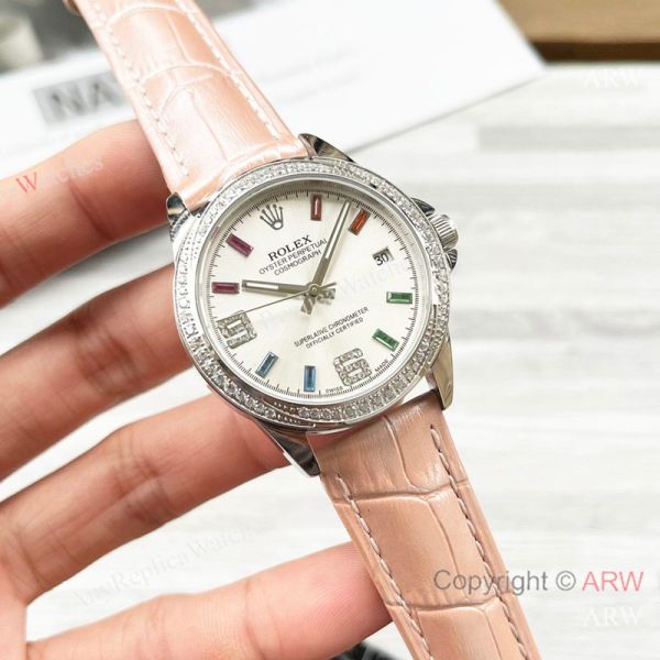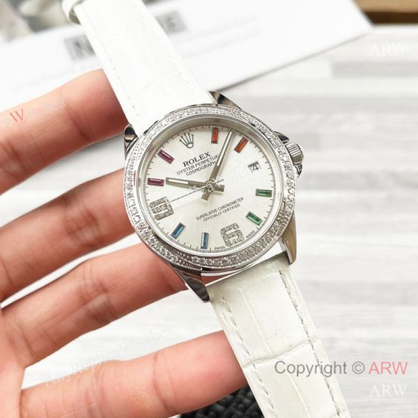 High Quality Replica Rolex Datejust Different Designs 316 stainless steel Genuine Leather strap Different Colors Face Dial Different Diamond Colors Ceramic Bezel Lady Watch 35*10mm