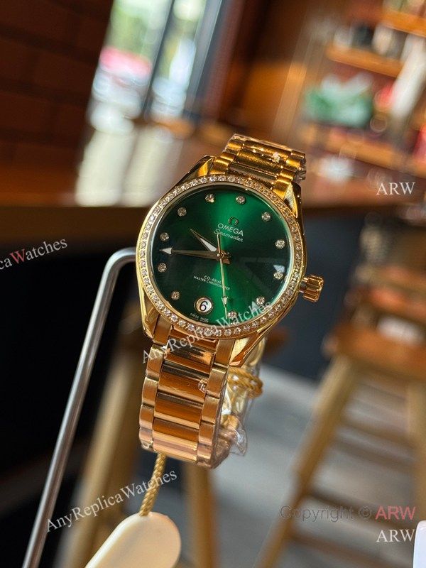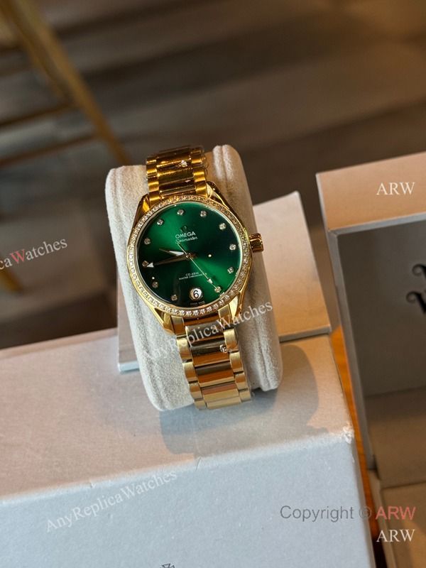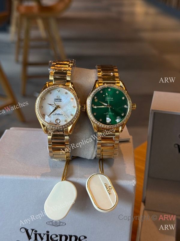 High Quality Replica Omega Gold strap Different Colors Face Dial White Diamonds Ceramic Bezel Lady Watch 34mm