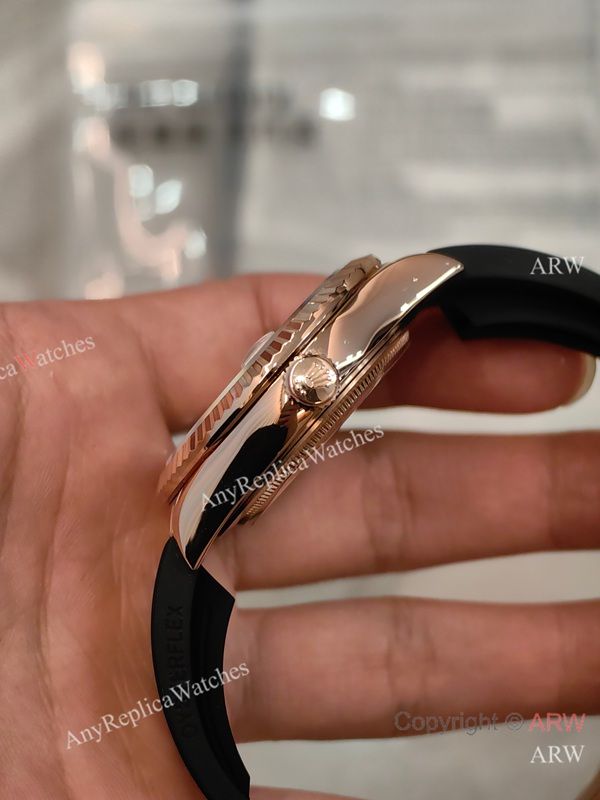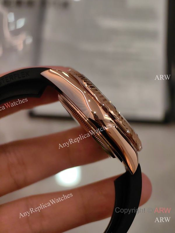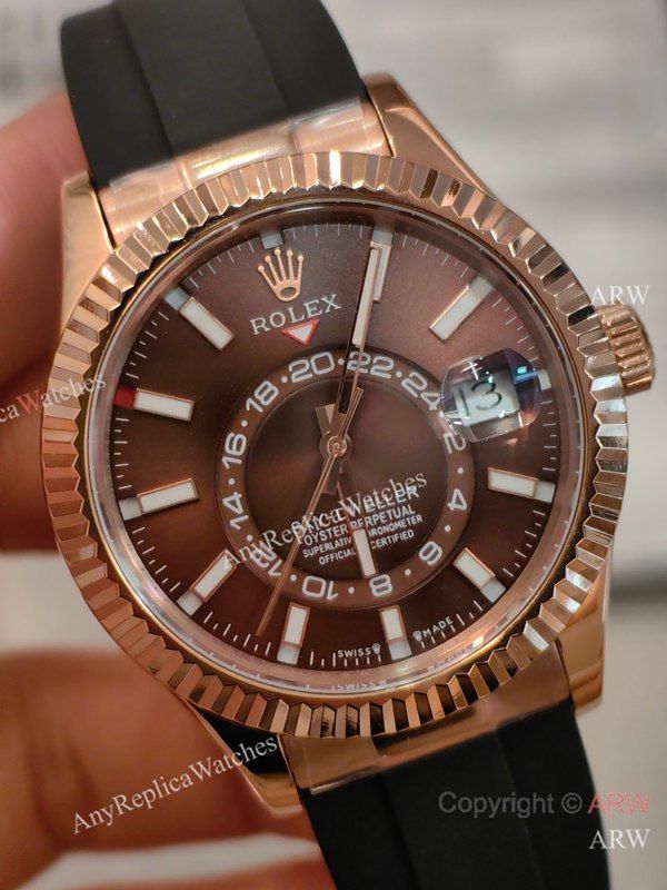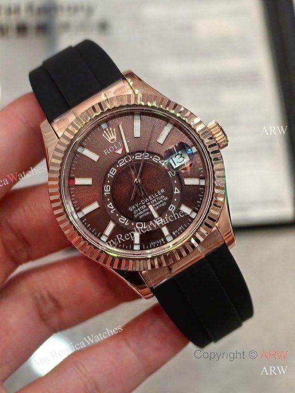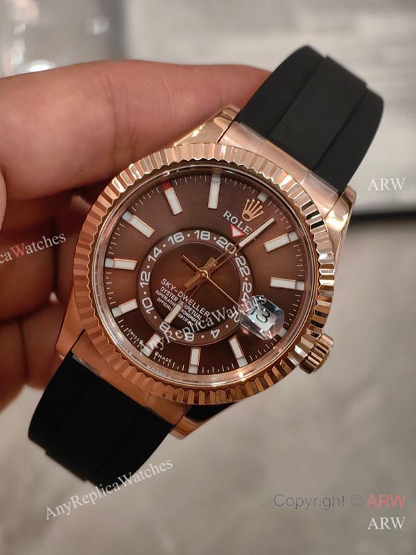 Replica ROLEX SKY-DWELLER Black Rubber Strap Dark Red Face Dial Rose Gold 904L Stainless Steel Case Watch 42mm