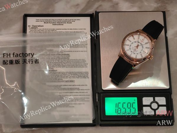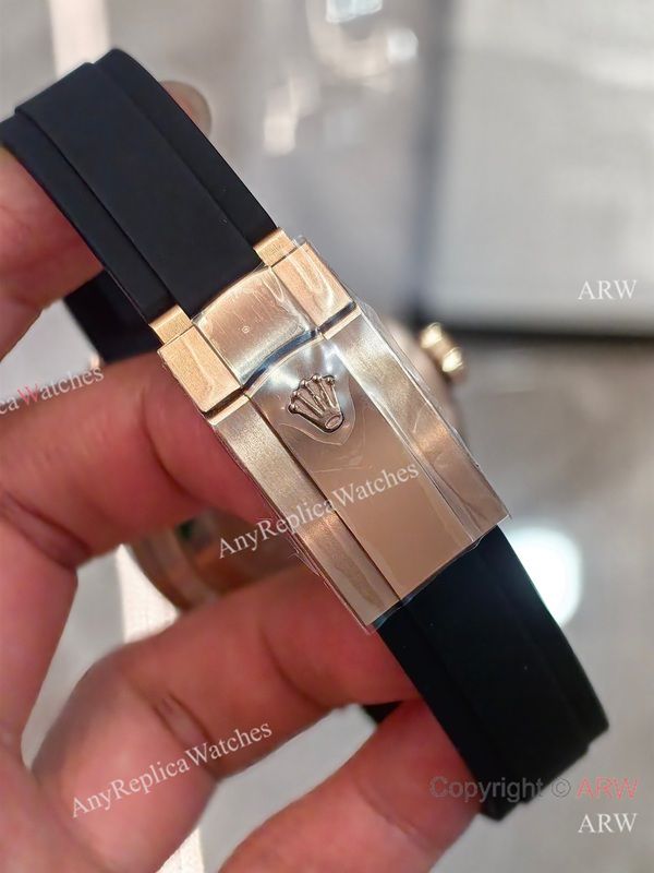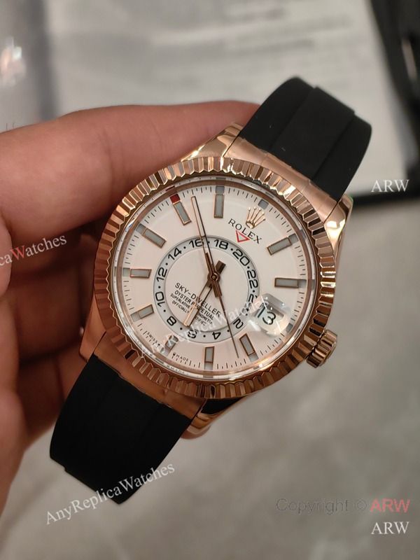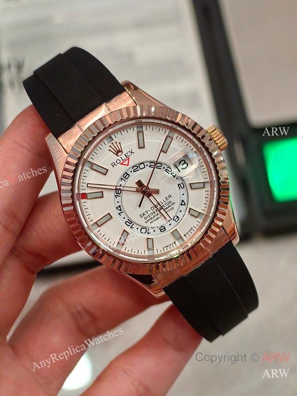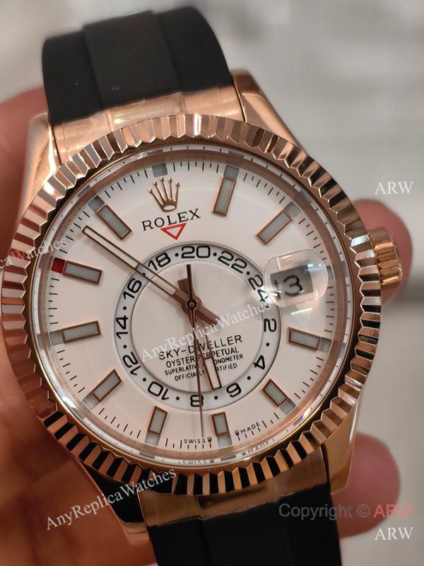 Replica ROLEX SKY-DWELLER Black Rubber Strap White Face Dial Rose Gold 904L Stainless Steel Case Watch 42mm