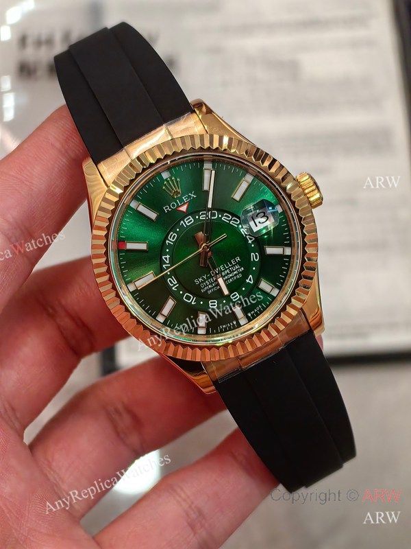 Replica ROLEX SKY-DWELLER Black Rubber Strap Emerald Green Face Dial Gold 904L Stainless Steel Case Watch 42mm