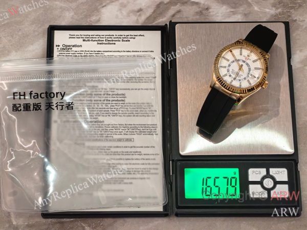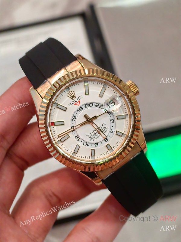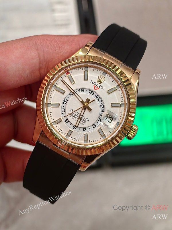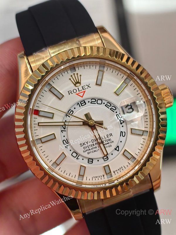 Replica ROLEX SKY-DWELLER Black Rubber Strap White Face Dial Gold 904L Stainless Steel Case Watch 42mm