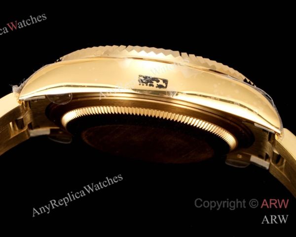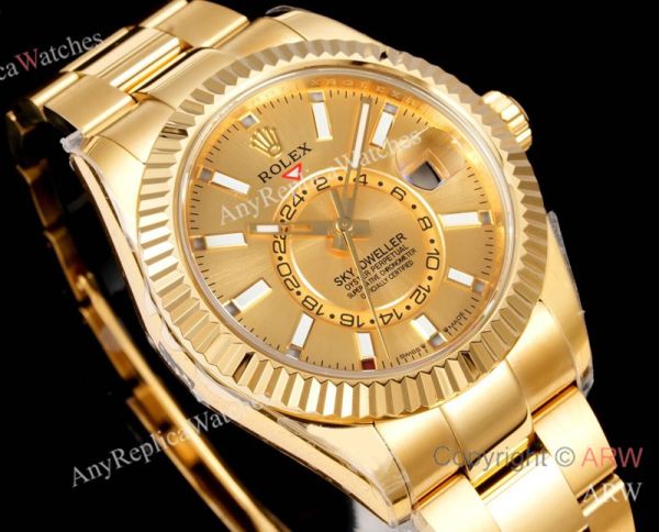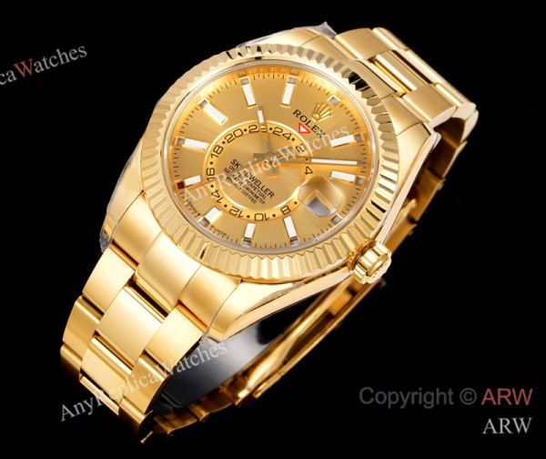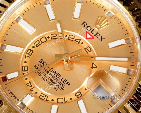 Replica ROLEX SKY-DWELLER Gold 904L Oyster Three/Five-Bead Stainless Steel Strap Gold Enamel Radiant Sunburst Face Dial Gold Case Watch 42mm