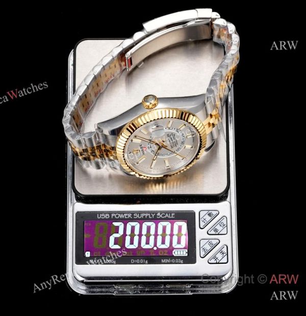Replica ROLEX SKY-DWELLER 2-Tone 904L Oyster Three/Five-Bead Stainless Steel Strap White Enamel Radiant Sunburst Face Dial Gold Case Watch 42mm