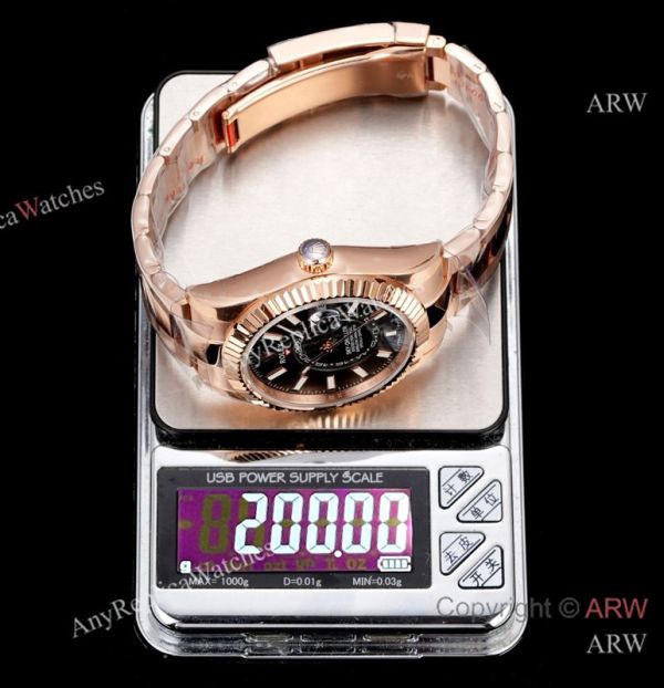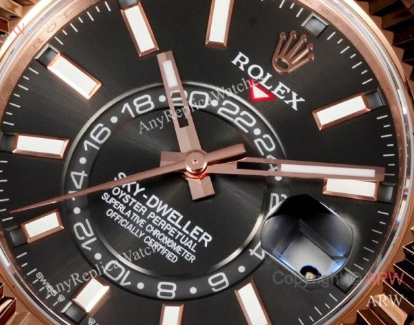 Replica ROLEX SKY-DWELLER Rose Gold 904L Oyster Three/Five-Bead Stainless Steel Strap Black Enamel Radiant Sunburst Face Dial Rose Gold Case Watch 42mm