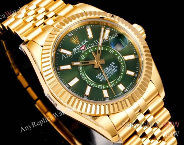 High Quality Replica ROLEX SKY-DWELLER Gold 904L Oyster Three/Five-Bead Stainless Steel Strap Emerald Green Enamel Radiant Sunburst Face Dial Gold Case Watch 42mm