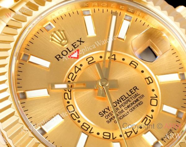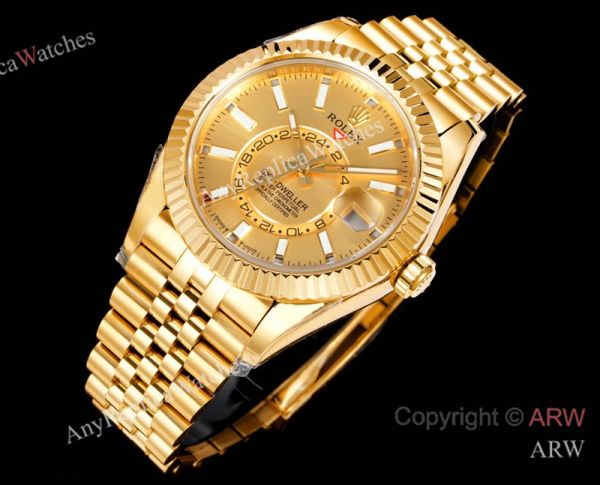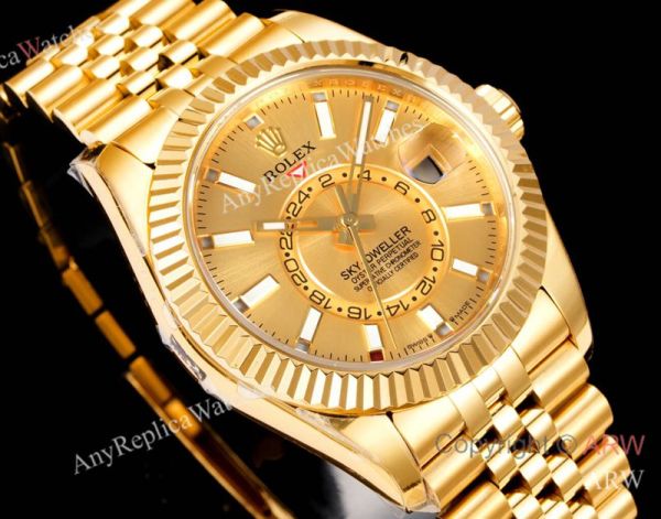 Replica ROLEX SKY-DWELLER Gold 904L Oyster Three/Five-Bead Stainless Steel Strap Gold Enamel Radiant Sunburst Face Dial Gold Case Watch 42mm