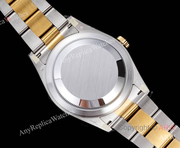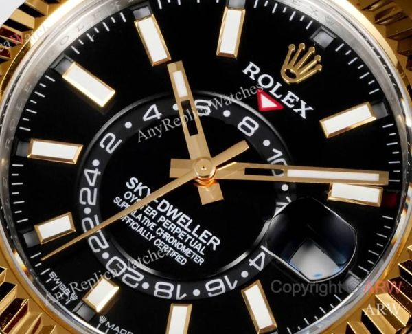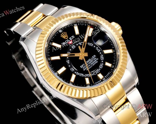 Replica ROLEX SKY-DWELLER 2-Tone 904L Oyster Three/Five-Bead Stainless Steel Strap Black Enamel Radiant Sunburst Face Dial Gold Case Watch 42mm
