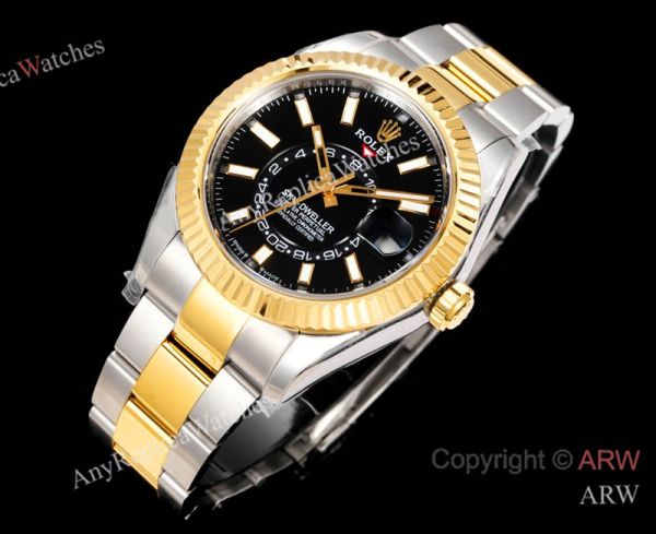 High Quality Replica ROLEX SKY-DWELLER 2-Tone 904L Oyster Three/Five-Bead Stainless Steel Strap Black Enamel Radiant Sunburst Face Dial Gold Case Watch 42mm