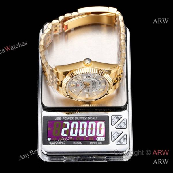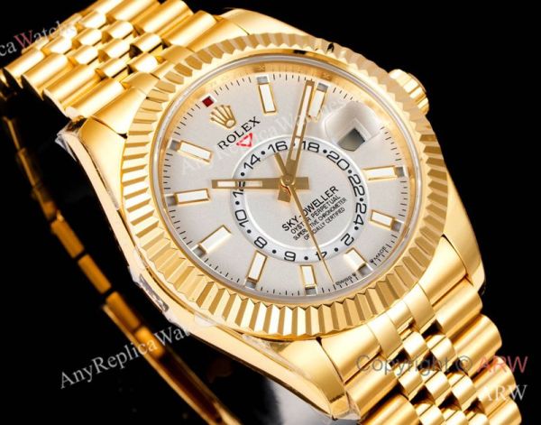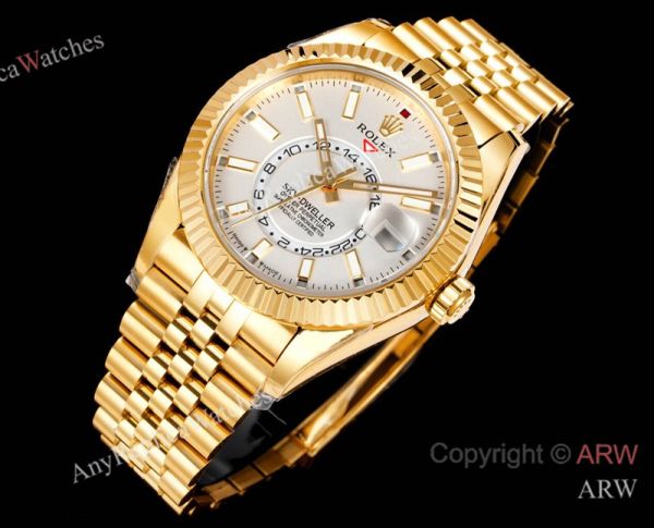 High Quality Replica ROLEX SKY-DWELLER Gold 904L Oyster Three/Five-Bead Stainless Steel Strap White Enamel Radiant Sunburst Face Dial Gold Case Watch 42mm