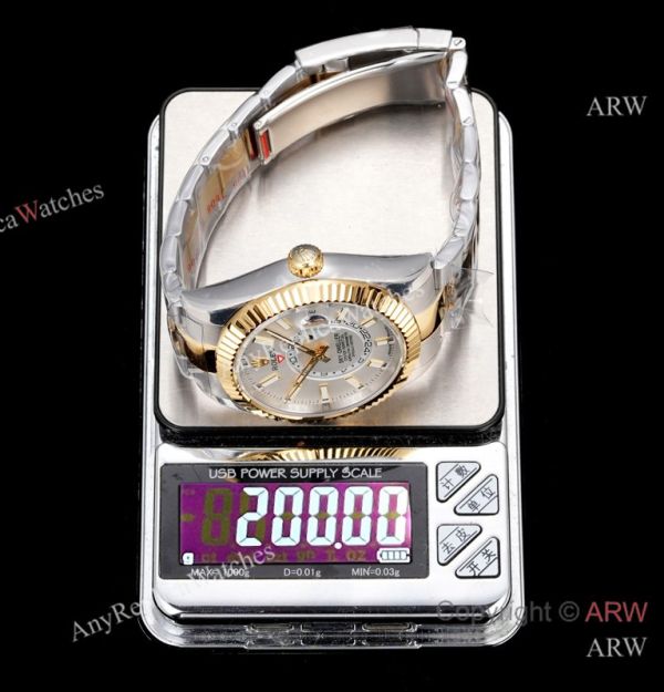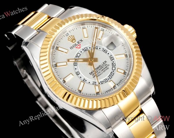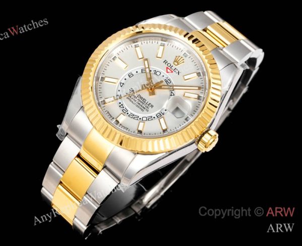 High Quality Replica ROLEX SKY-DWELLER 2-Tone 904L Oyster Three/Five-Bead Stainless Steel Strap White Enamel Radiant Sunburst Face Dial Gold Case Watch 42mm