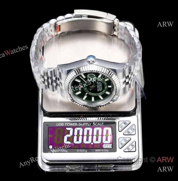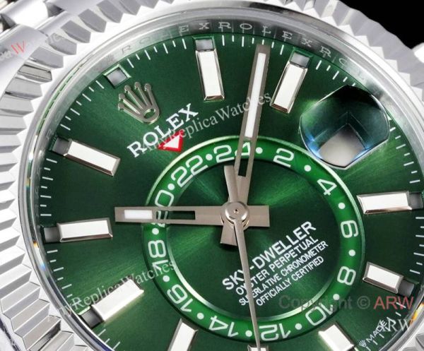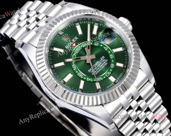 Replica ROLEX SKY-DWELLER Silver 904L Oyster Three/Five-Bead Stainless Steel Strap Emerald Green Enamel Radiant Sunburst Face Dial Silver Case Watch 42mm